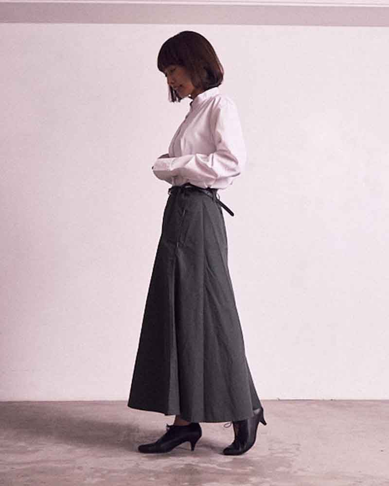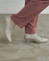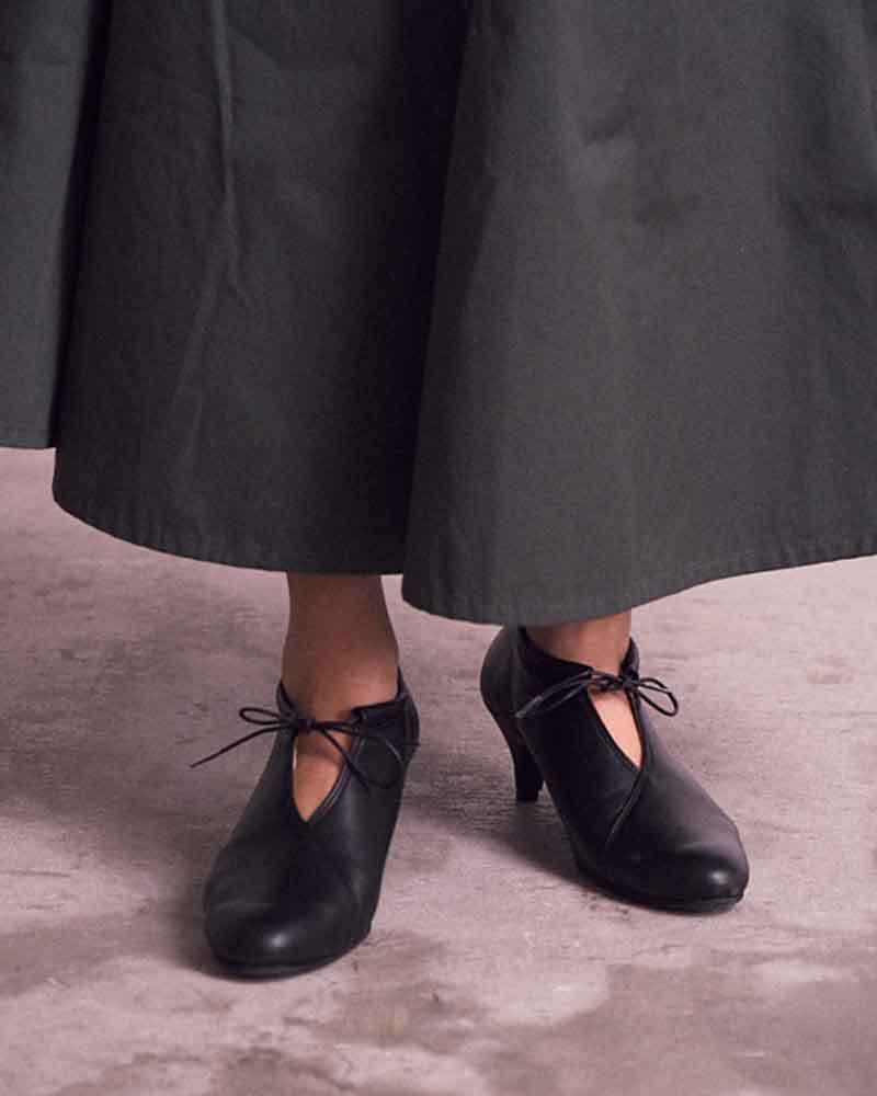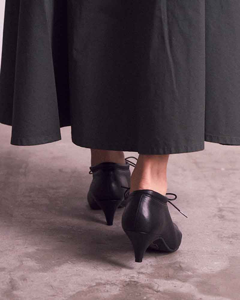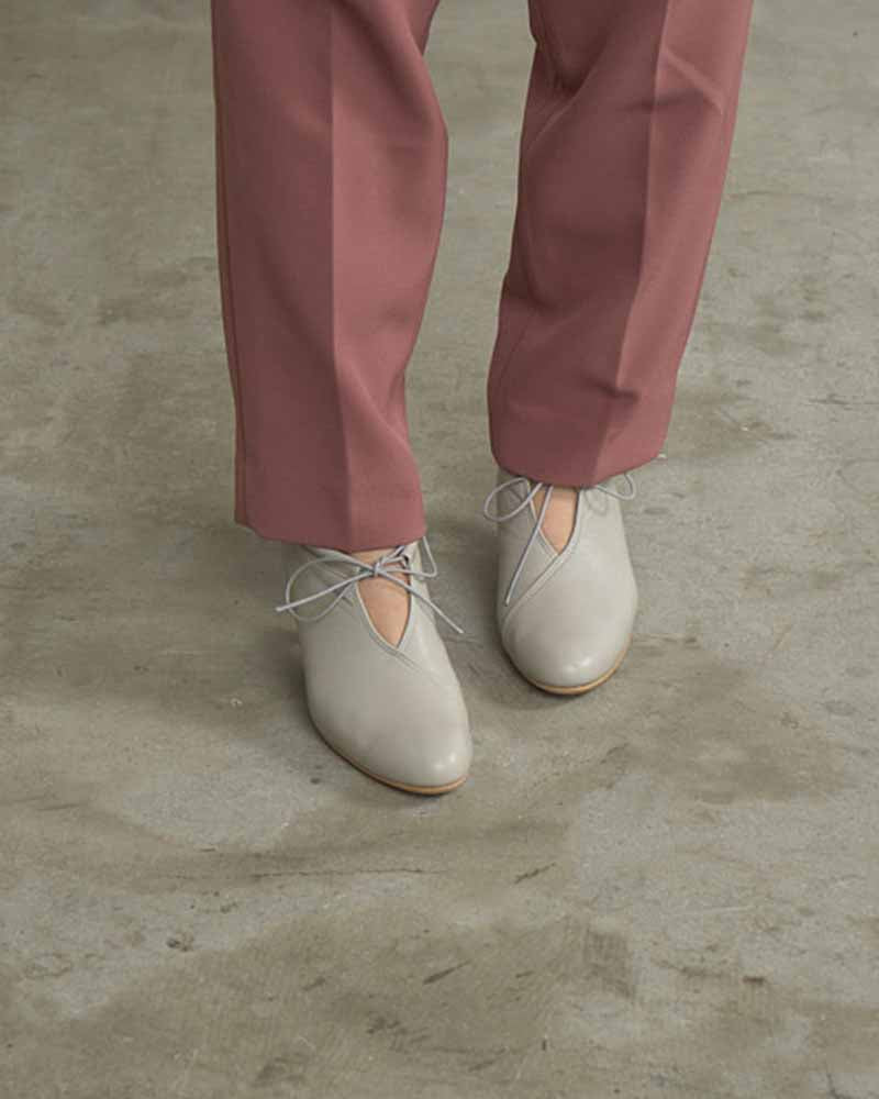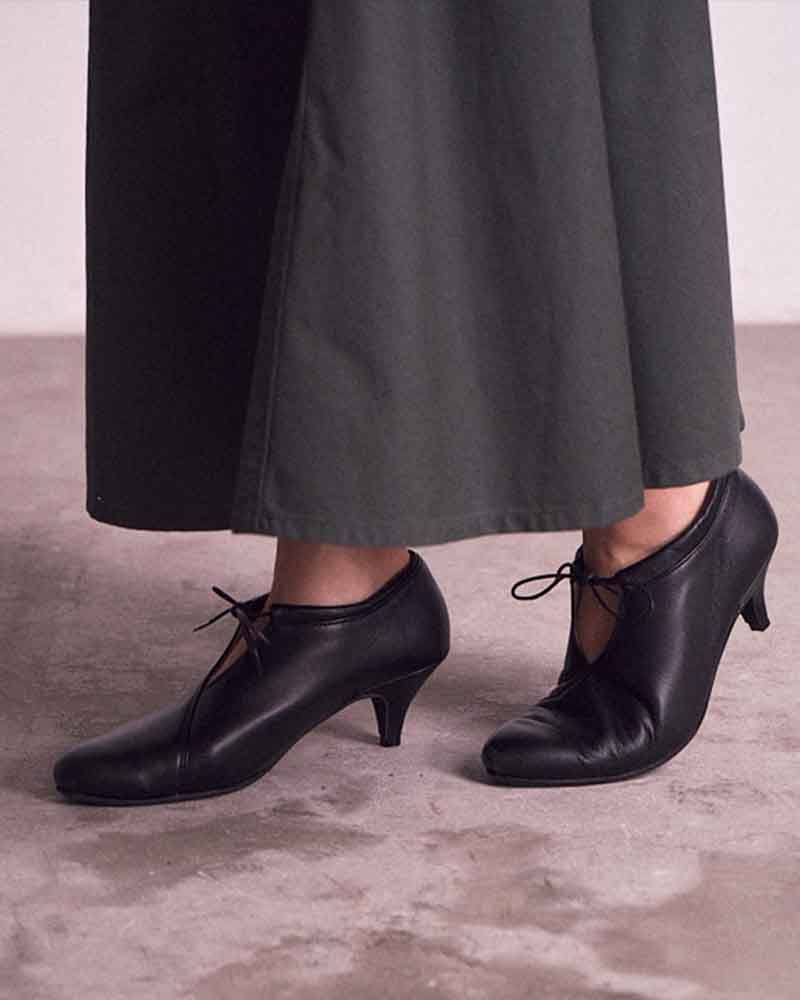 甲のスリットディテールが程よい抜け感を出してくれるので、フルレングスのボトム〜ミモレ丈のスカートまで、マニッシュにもエレガンスにも使いやすいアイテムです。タイツやソックスとの合わせもおすすめです。