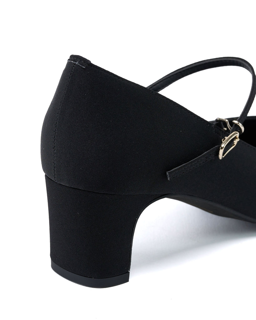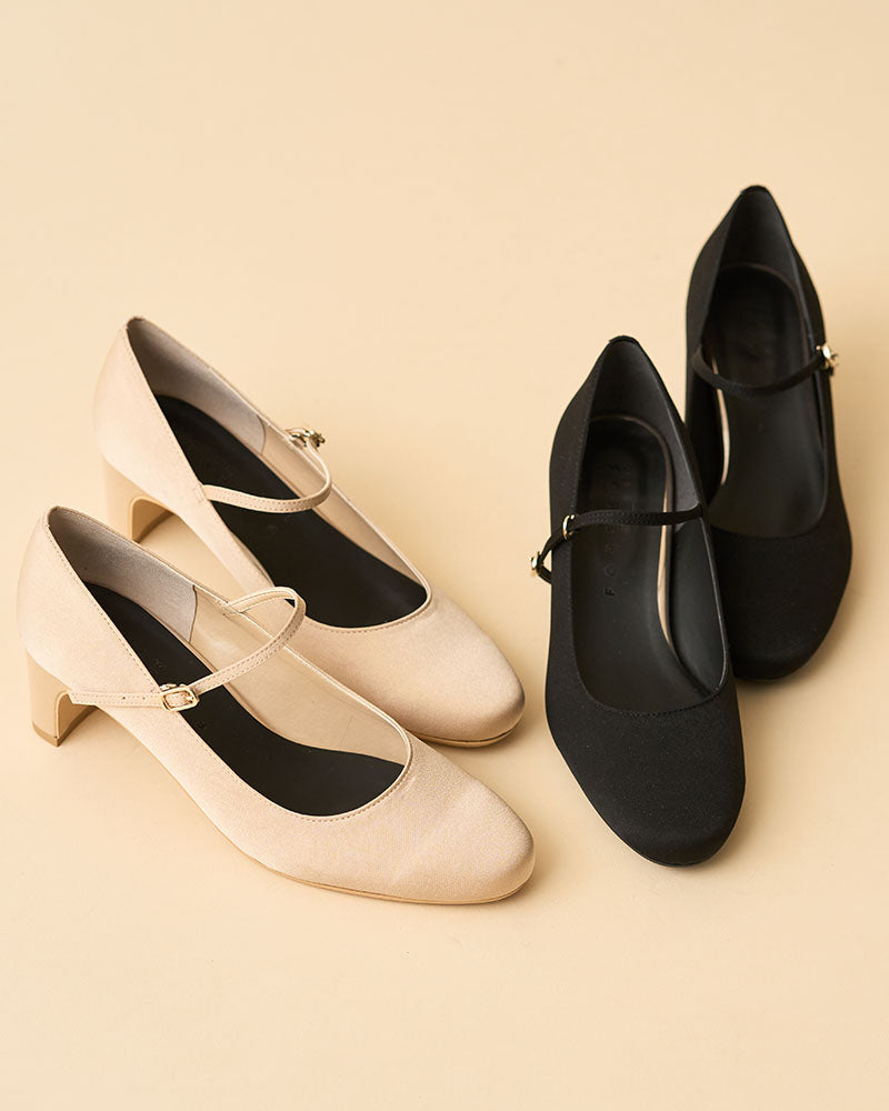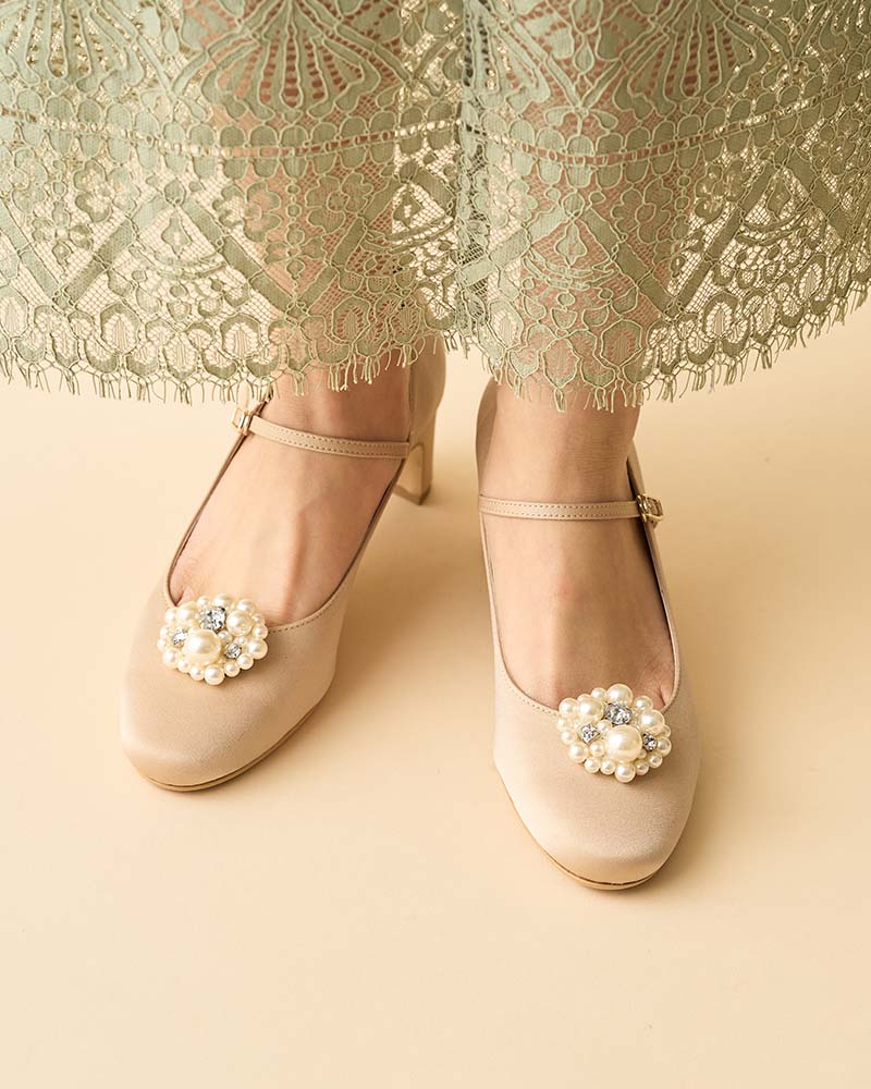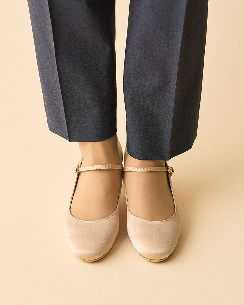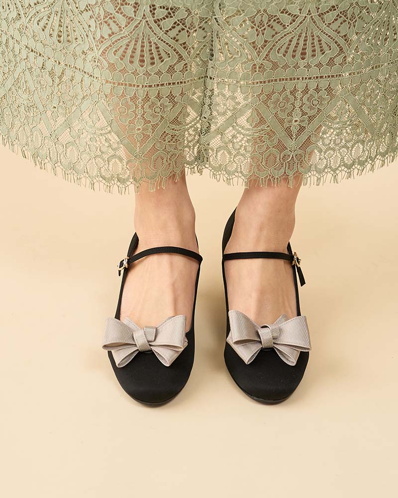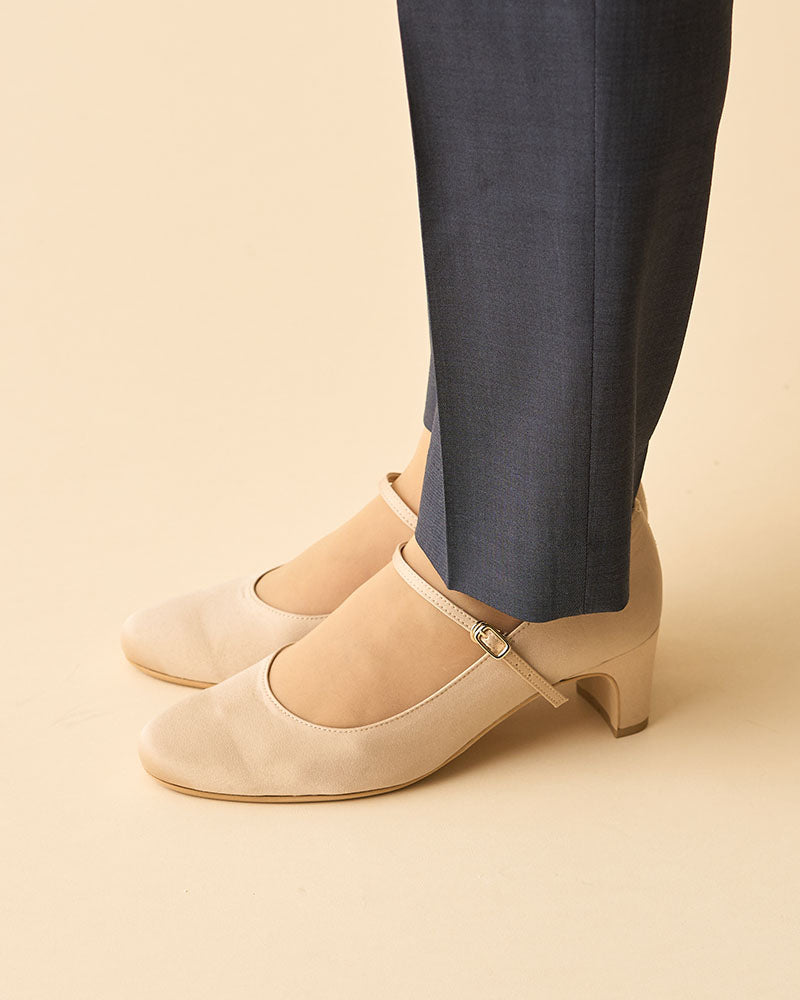 甲ベルトでしっかりと足を押さえてくれる上、ヒール形状も安定感あるものを使用しています。ストラップは極力細くすることで、大人っぽくエレガントに仕上げています。光沢感を抑えた上品なサテン生地を仕様しているので、ボトムの素材感とのマッチングも悩まずにお使いいただけます。