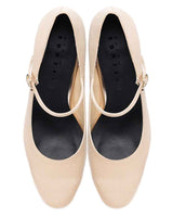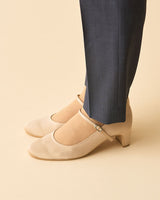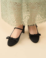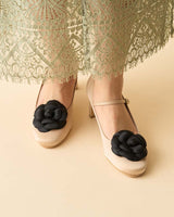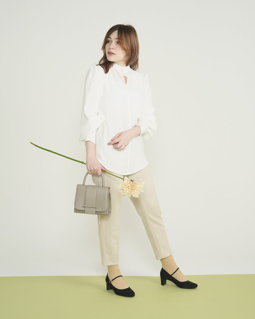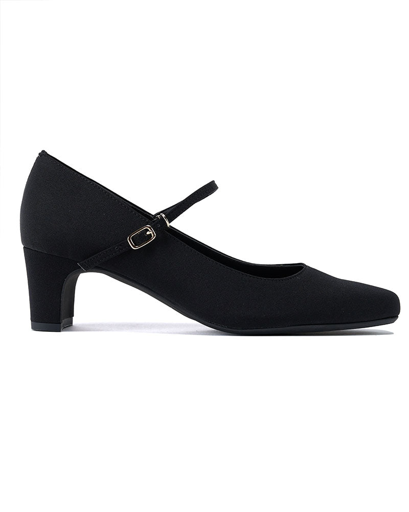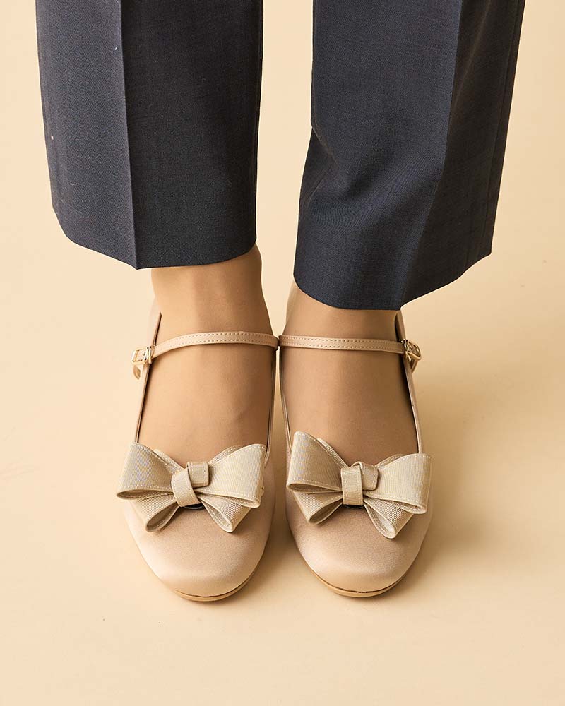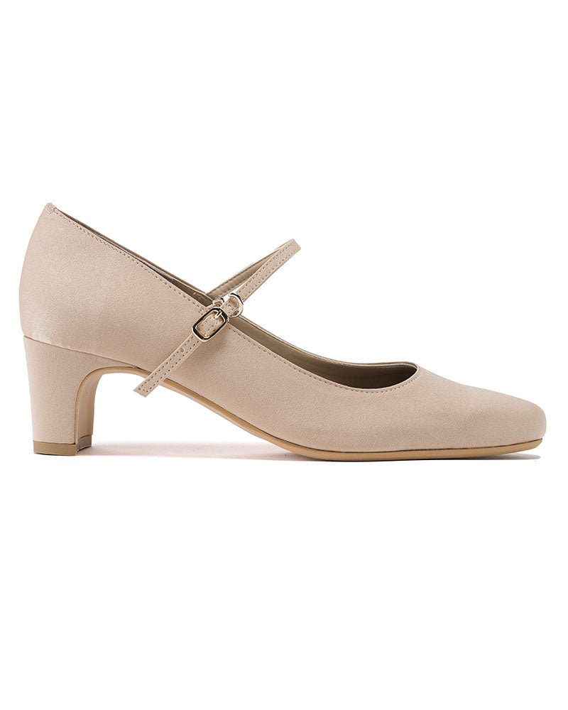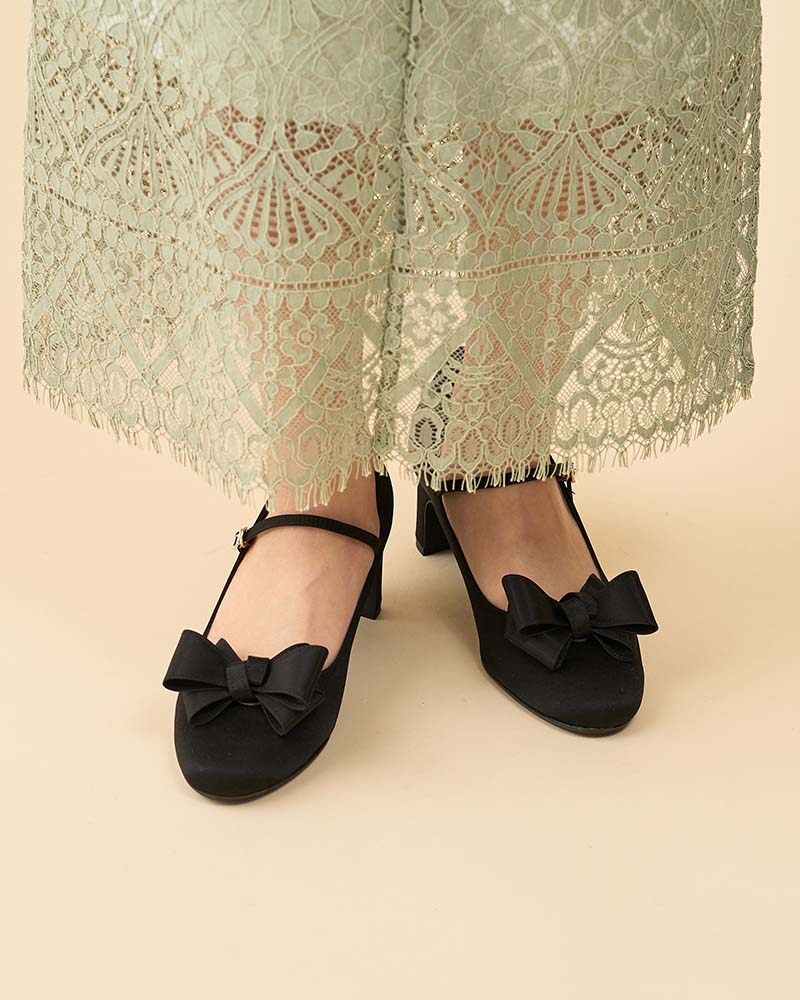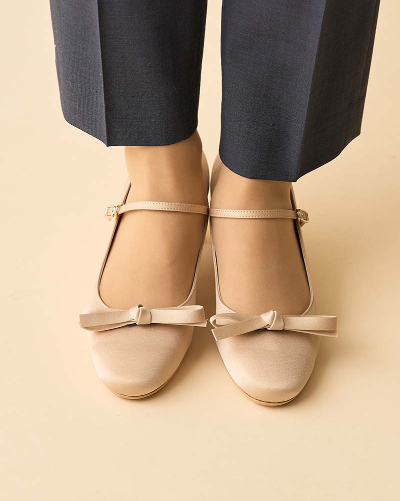 甲ベルトでしっかりと足を押さえてくれる上、ヒール形状も安定感あるものを使用しています。ストラップは極力細くすることで、大人っぽくエレガントに仕上げています。光沢感を抑えた上品なサテン生地を仕様しているので、ボトムの素材感とのマッチングも悩まずにお使いいただけます。