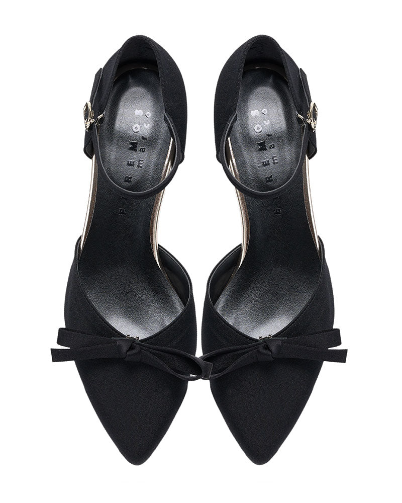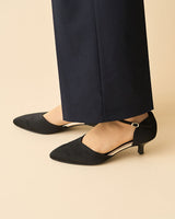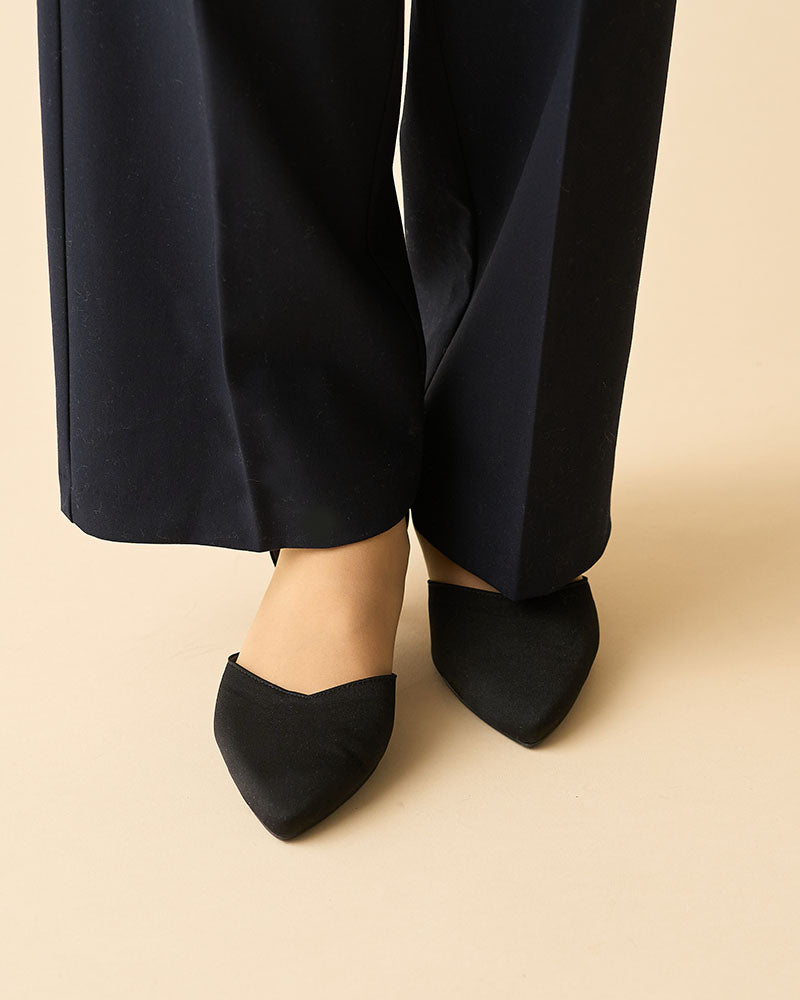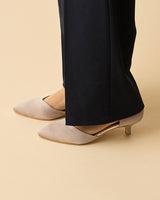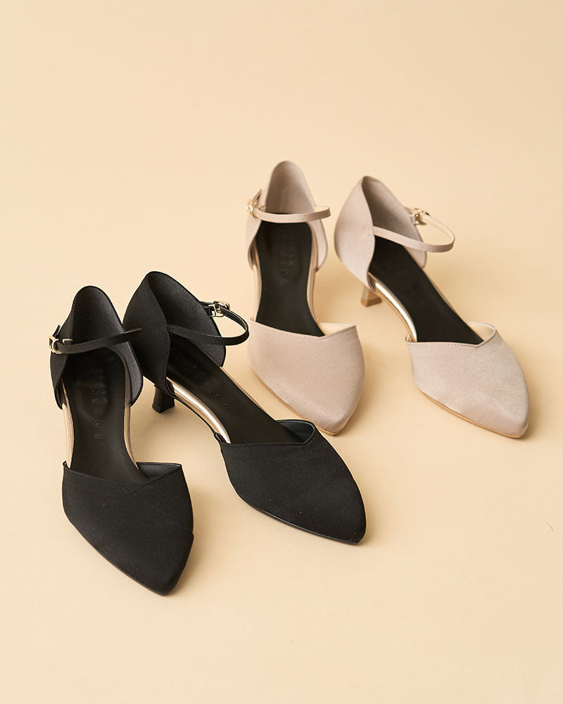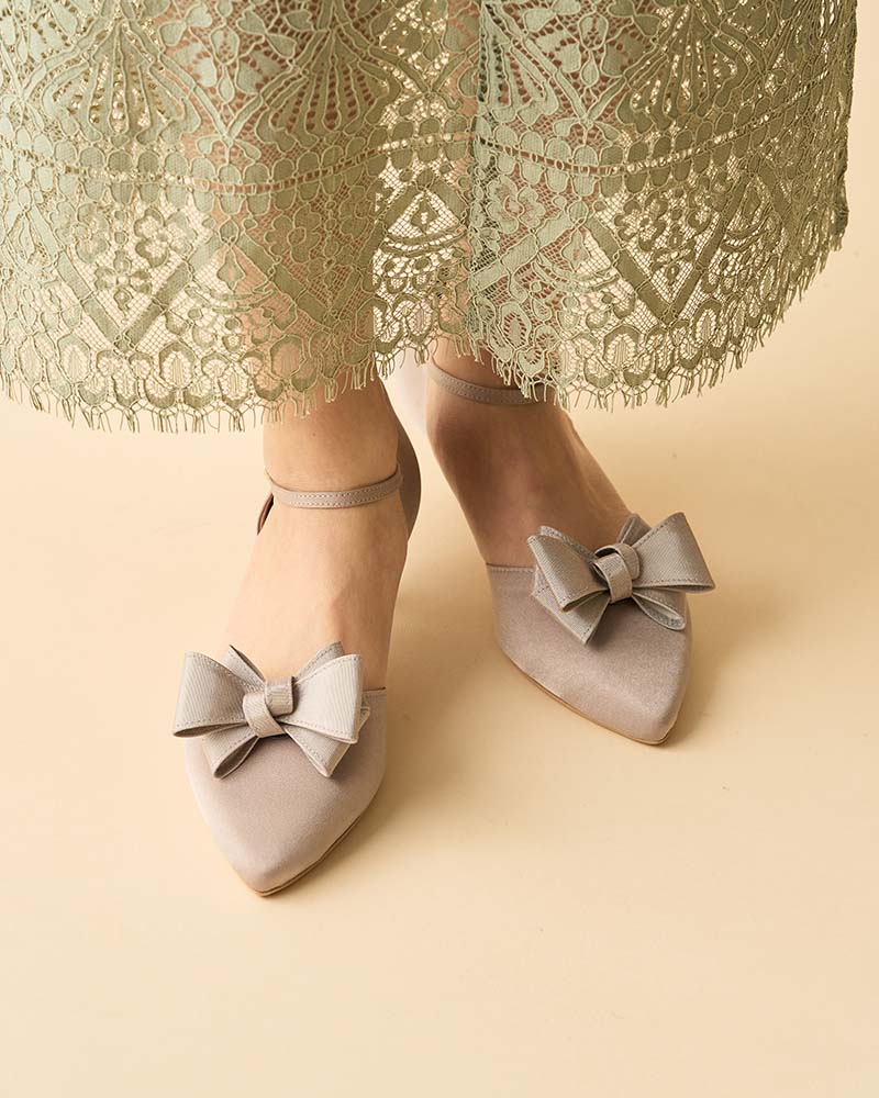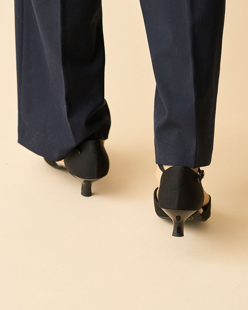 ヒールが苦手な方でも、フォーマルなシーンに履きやすいポインテッドセパレートパンプス。低めに設定したヒールでも、ポインテッドトゥとセパレートの抜け感でエレガントな1足に仕上げています。光沢感を抑えた上品なサテン生地を仕様しているので、ボトムの素材感とのマッチングも悩まずにお使いいただけます。