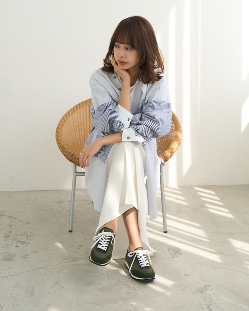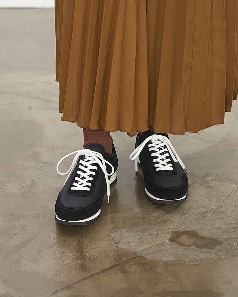 すっきりとしたシルエットが大人見えな一足で、靴紐の色も気分やコーデによって変えられるのが嬉しい! レザーと生地のコンビも高見えするし、スカートとの相性も抜群な一足だと思います。