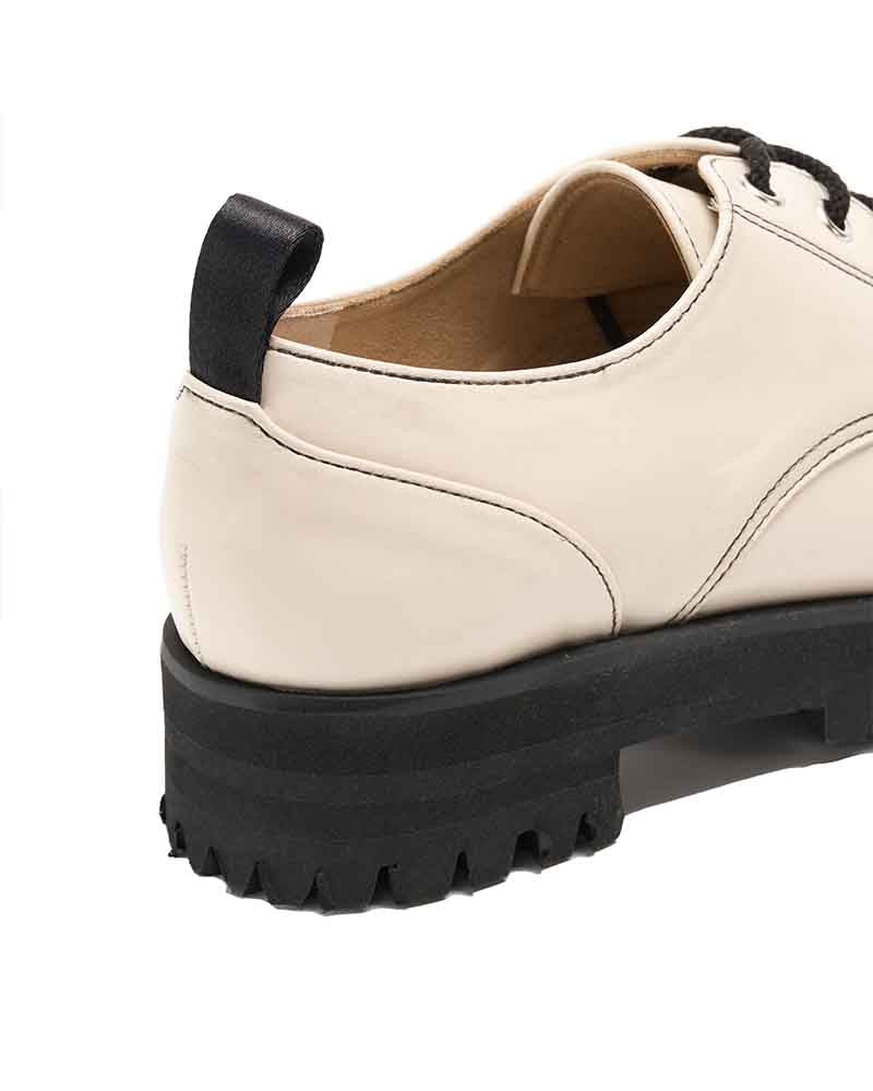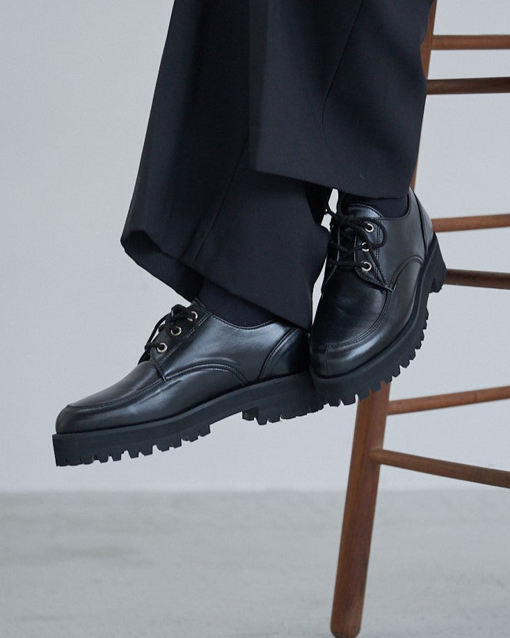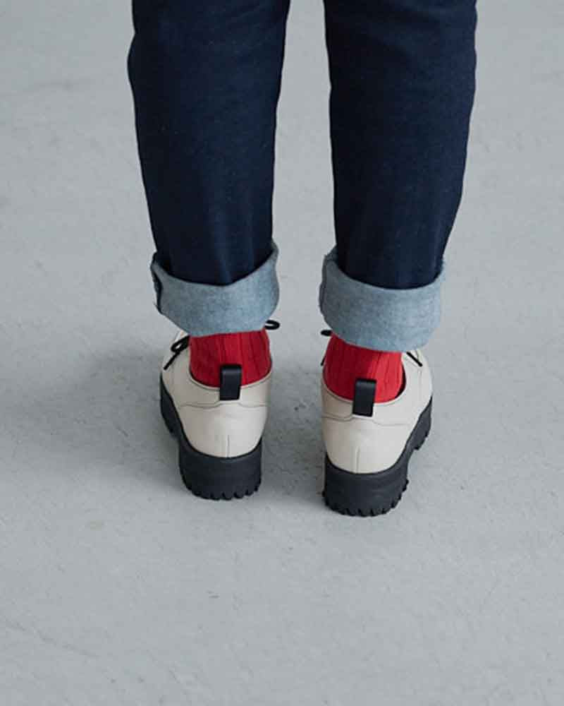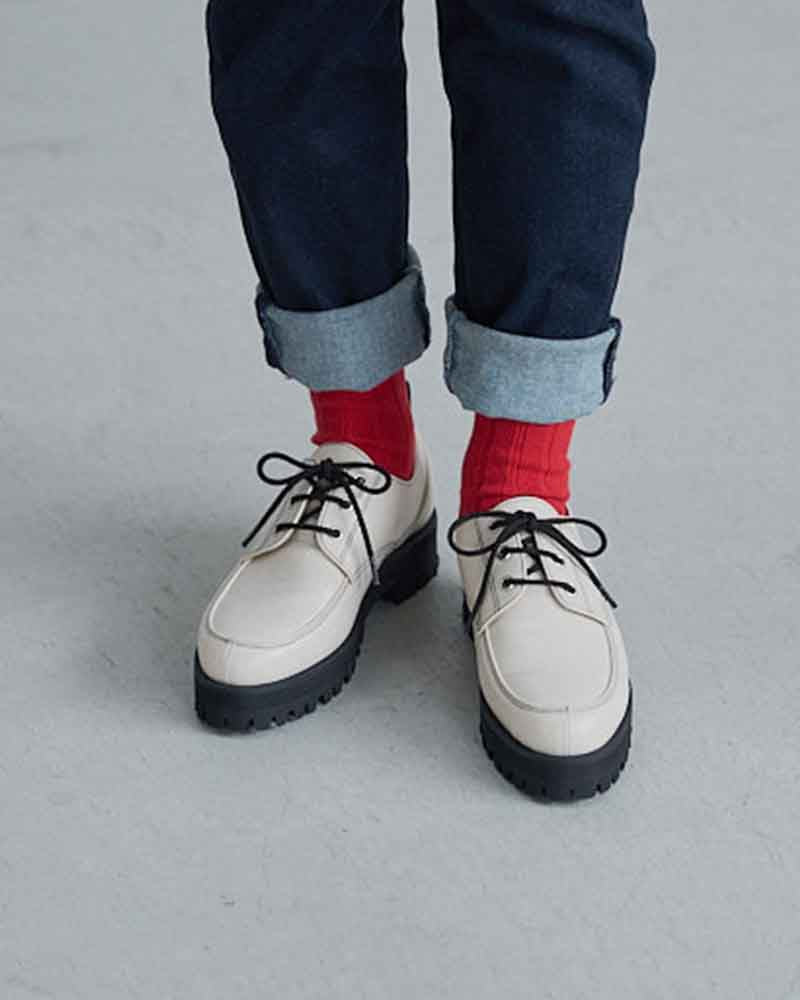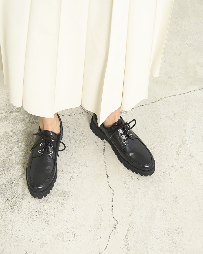 ソックス合わせがおすすめのシューズ。今期トレンドのハーフボトムとの相性も抜群です。ブラックはモードに、エクリュはバイカラーを楽し見ながらカジュアル使いしやすいカラーに仕上げています。
