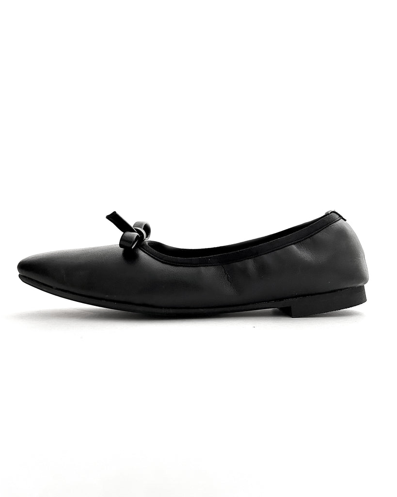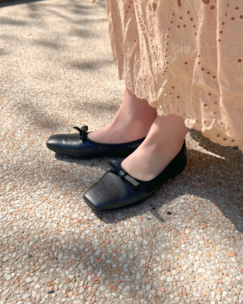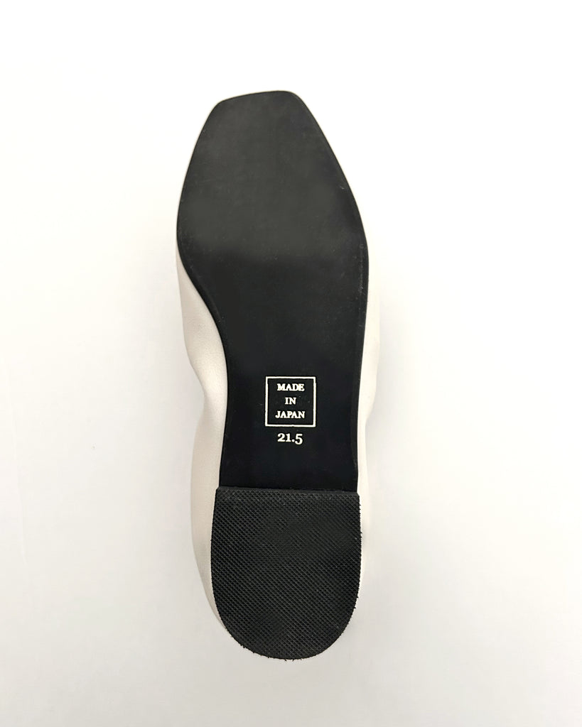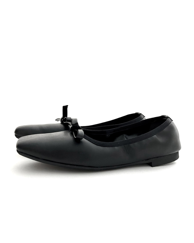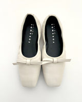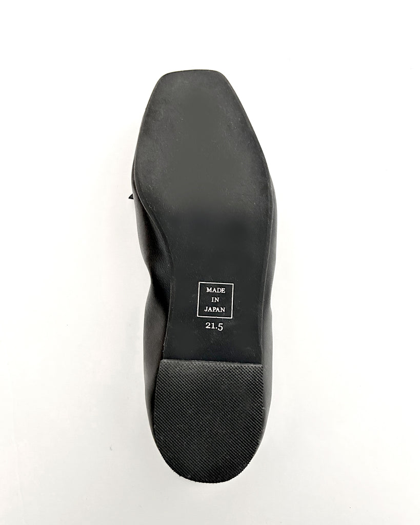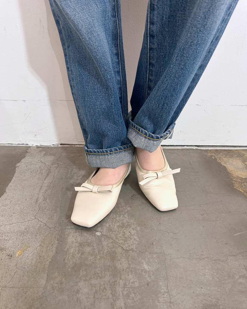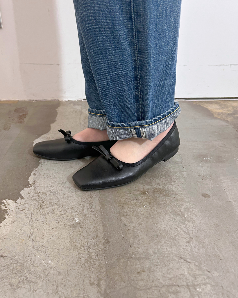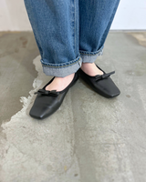 アッパーと同素材のリボンモチーフがエレガントで大人なバレエパンプスに仕上がっています。