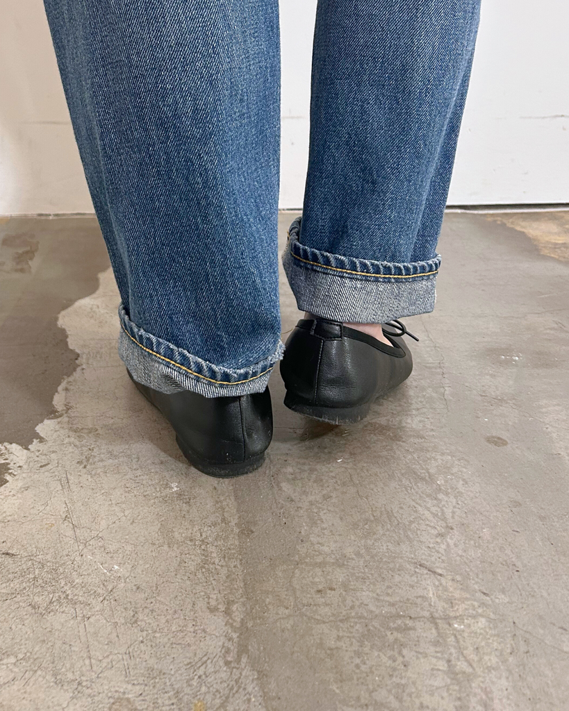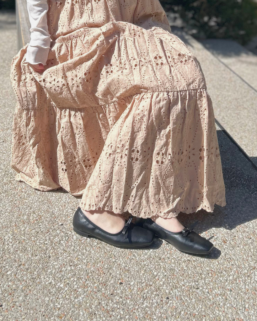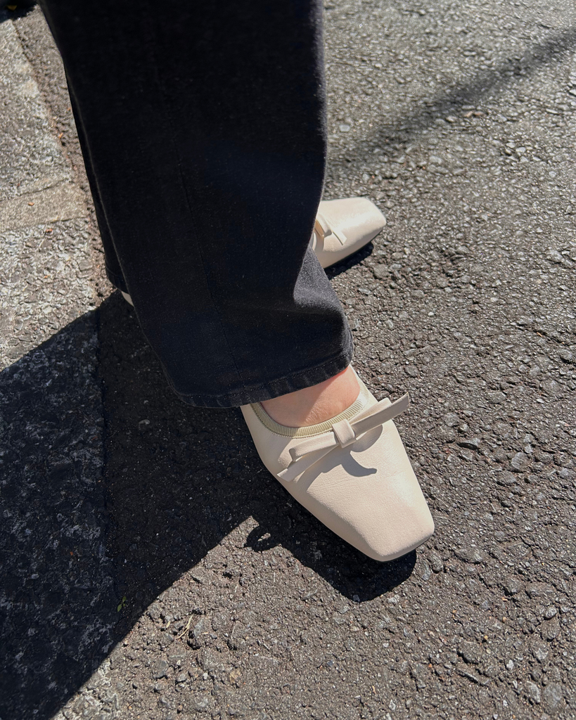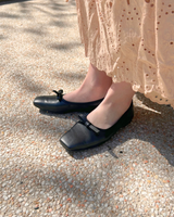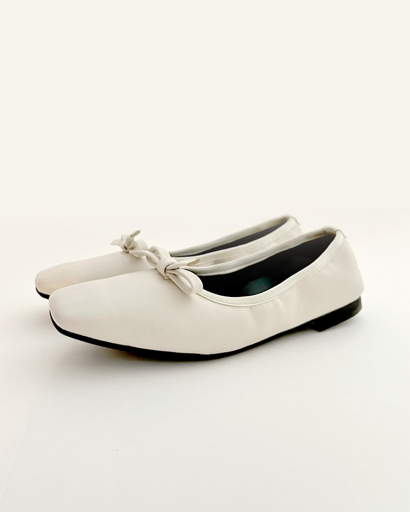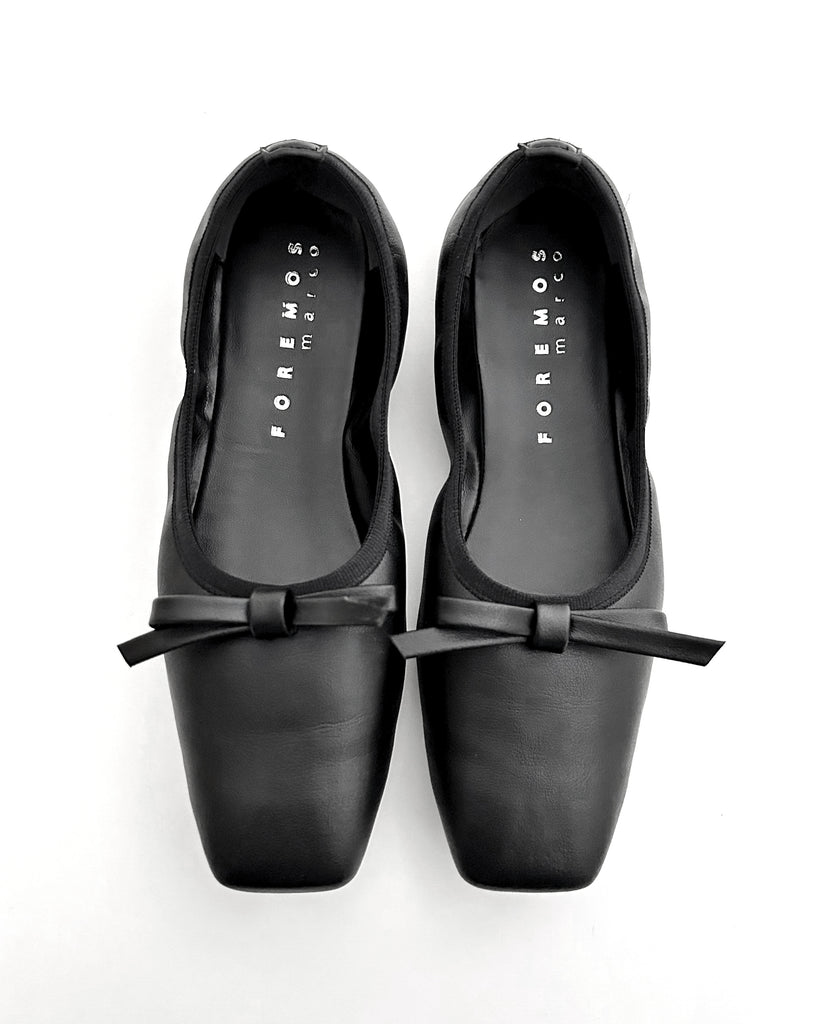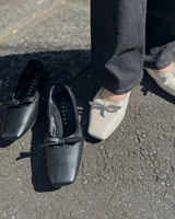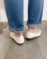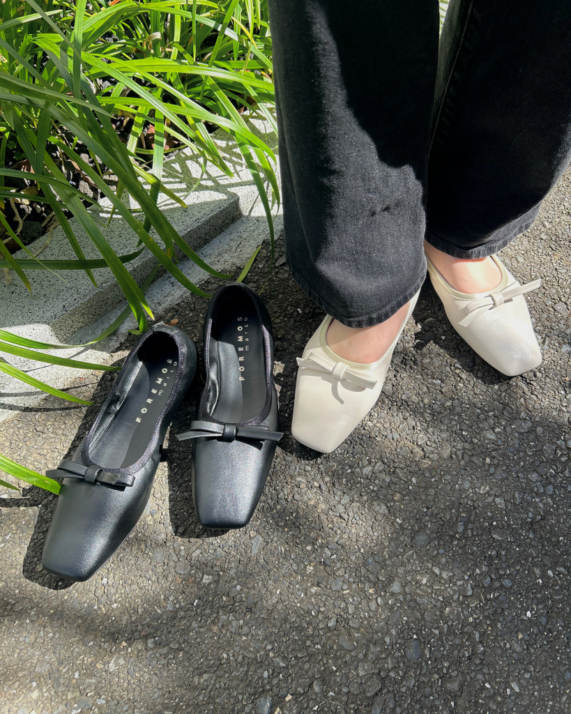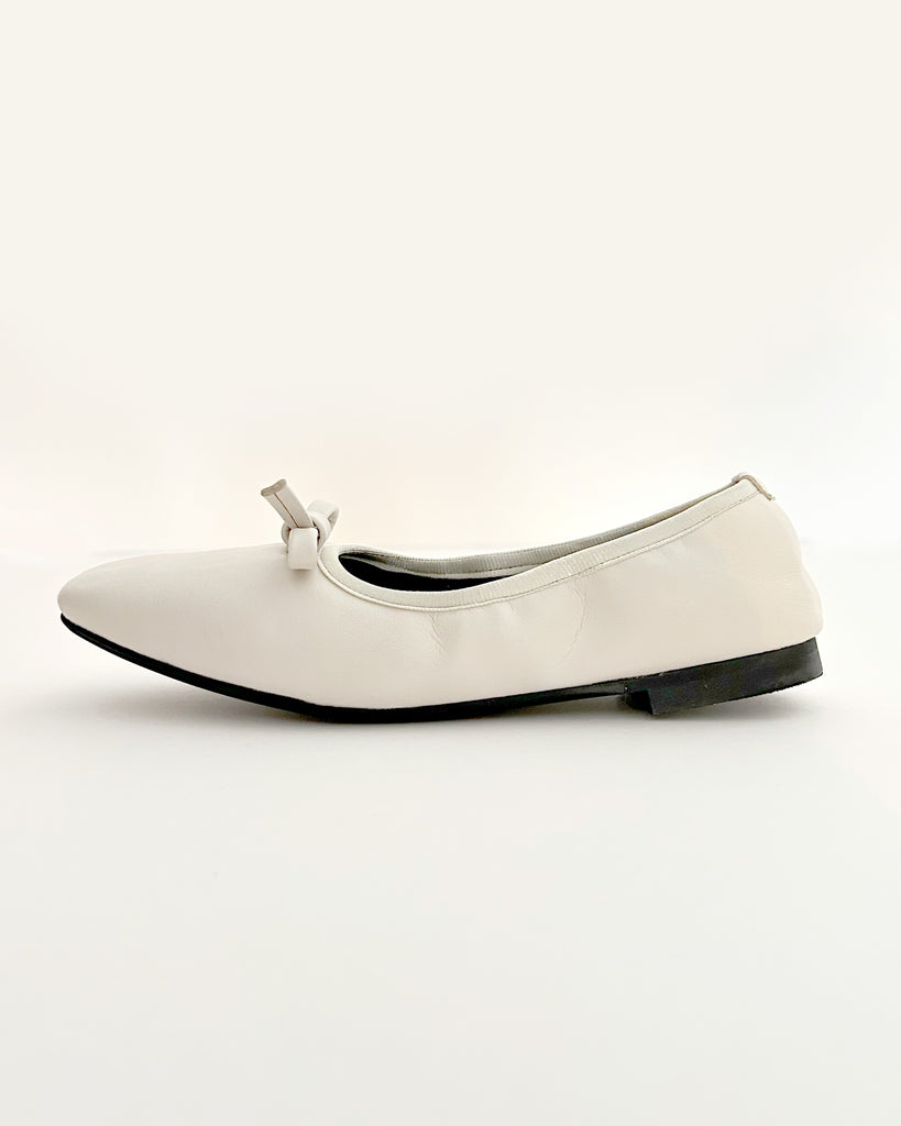 アッパーと同素材のリボンモチーフがエレガントで大人なバレエパンプスに仕上がっています。